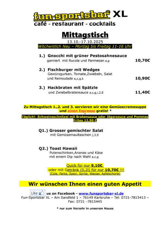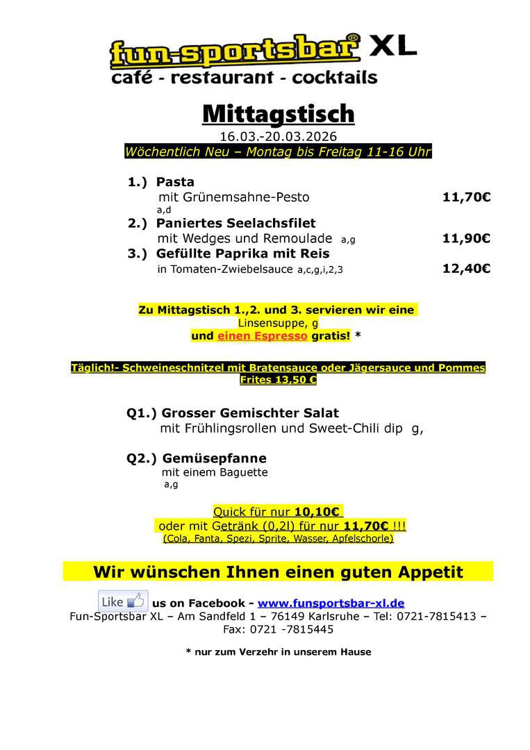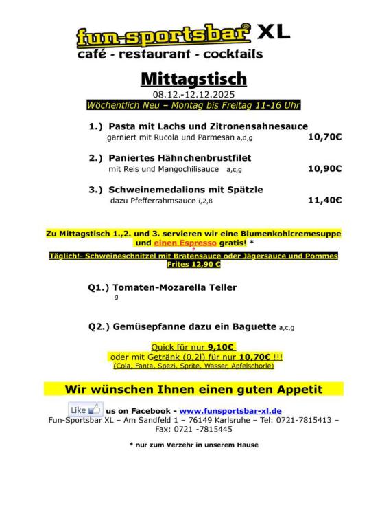 Gerne senden wir Ihnen jede Woche per email unsere aktuelle Mittagstischkarte direkt an den Arbeitsplatz, hinterlassen Sie hierzu ihre email-Adresse beim Servicepersonal, oder senden Sie uns eine kurze Nachricht an info@funsportsbar-xl.de